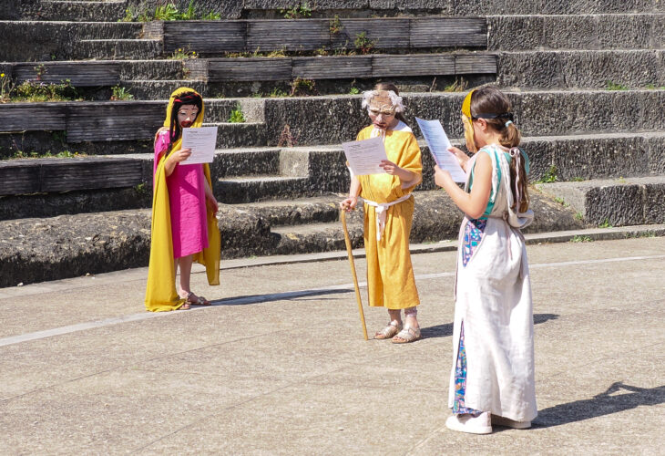 Ce vendredi matin s’est tenu, au théâtre antique, dans le cadre des Vacances du patrimoine le premier atelier dédié aux spectacles des théâtres romains. Les enfants participants ont pu revêtir des costumes et des masques tels qu’on les fabriquait dans l’Antiquité. Ils ont ensuite pu interpréter, sur les conseils de la guide-conférencière Lucie Mazoyer, des extraits de célèbres pièces latines.